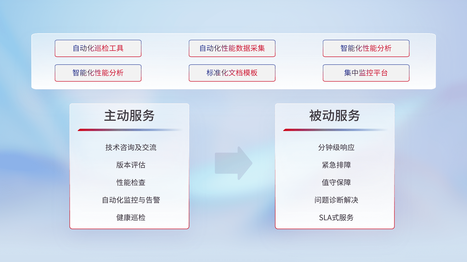 智能化工具和标准化文档,,保障服务质量,,提供主动服务(包含技术咨询、、、、版本评估、、性能检查、、、自动化监控与告警、、、、健康巡检)和被动服务包含(分钟级响应、、、紧急排障、、、值守保障、、、问题诊断解决、、SLA服务)。。。